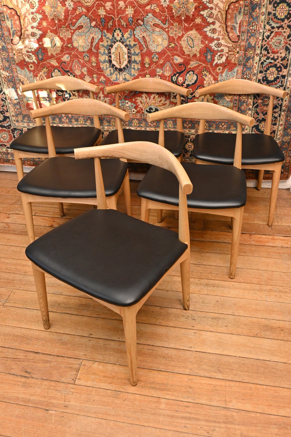 A SET OF SIX MID CENTURY STLYE OAK AND VINYL DINING CHAIRS (A/F) (75H X 51W X 54D CM) (LEONARD JOEL DELIVERY SIZE: X-LARGE)