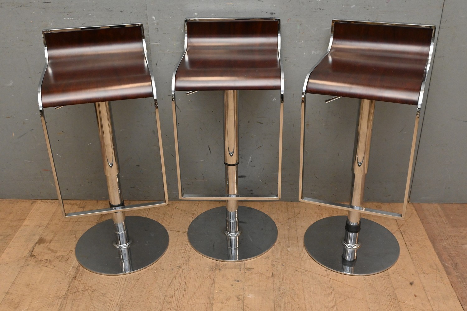 A SET OF THREE CHROME & TIMBER BARSTOOLS (85H X 36W X 40D CM) (LEONARD JOEL DELIVERY SIZE: LARGE)