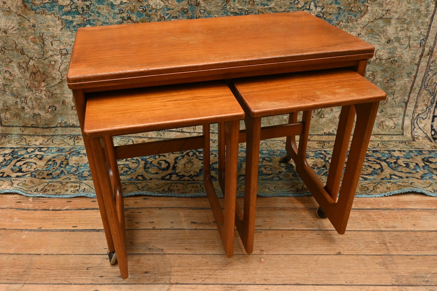 A NEST OF THREE MID CENTURY SCOTTISH MACINTOSH EXTENADBLE TOP TABLES (A/F) ( 61H X 74W X 41D CM) (LEONARD JOEL DELIVERY SIZE: LARGE)