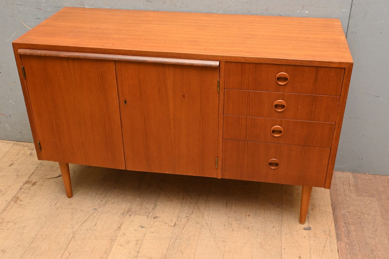 A SWEDISH TEAK MID CENTURY SIDEBOARD WITH PULL OUT DESK, C1950'S (A/F) (74H X 115W X 47D CM) (LEONARD JOEL DELIVERY SIZE: X-LARGE)