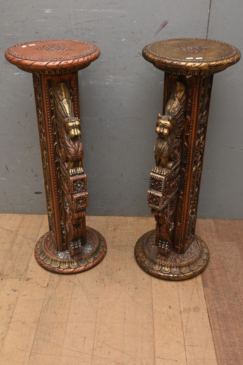 A PAIR OF DECORATIVELY CARVED ANGLO INDIAN PEDASTALS (90H X 42W X 34D CM) (LEONARD JOEL DELIVERY SIZE: X-LARGE)