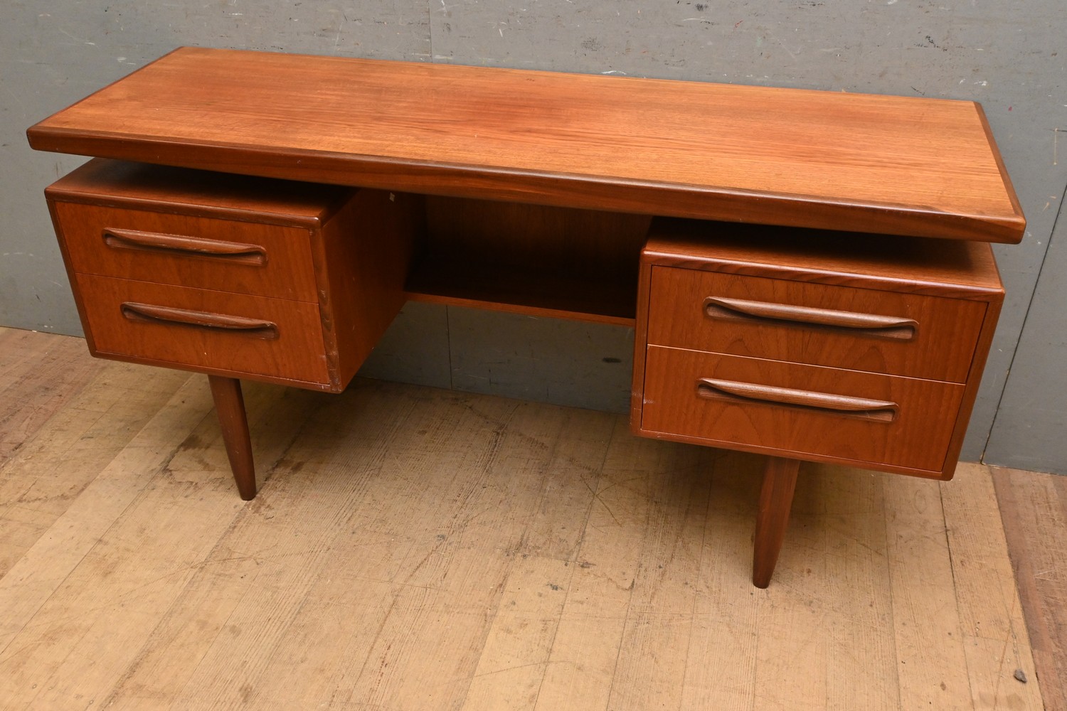 A MID CENTURY G- PLAN VB WILKINSFOUR DRAWER DESK (A/F) (74H X 146W X 46D CM) (LEONARD JOEL DELIVERY SIZE: X-LARGE)