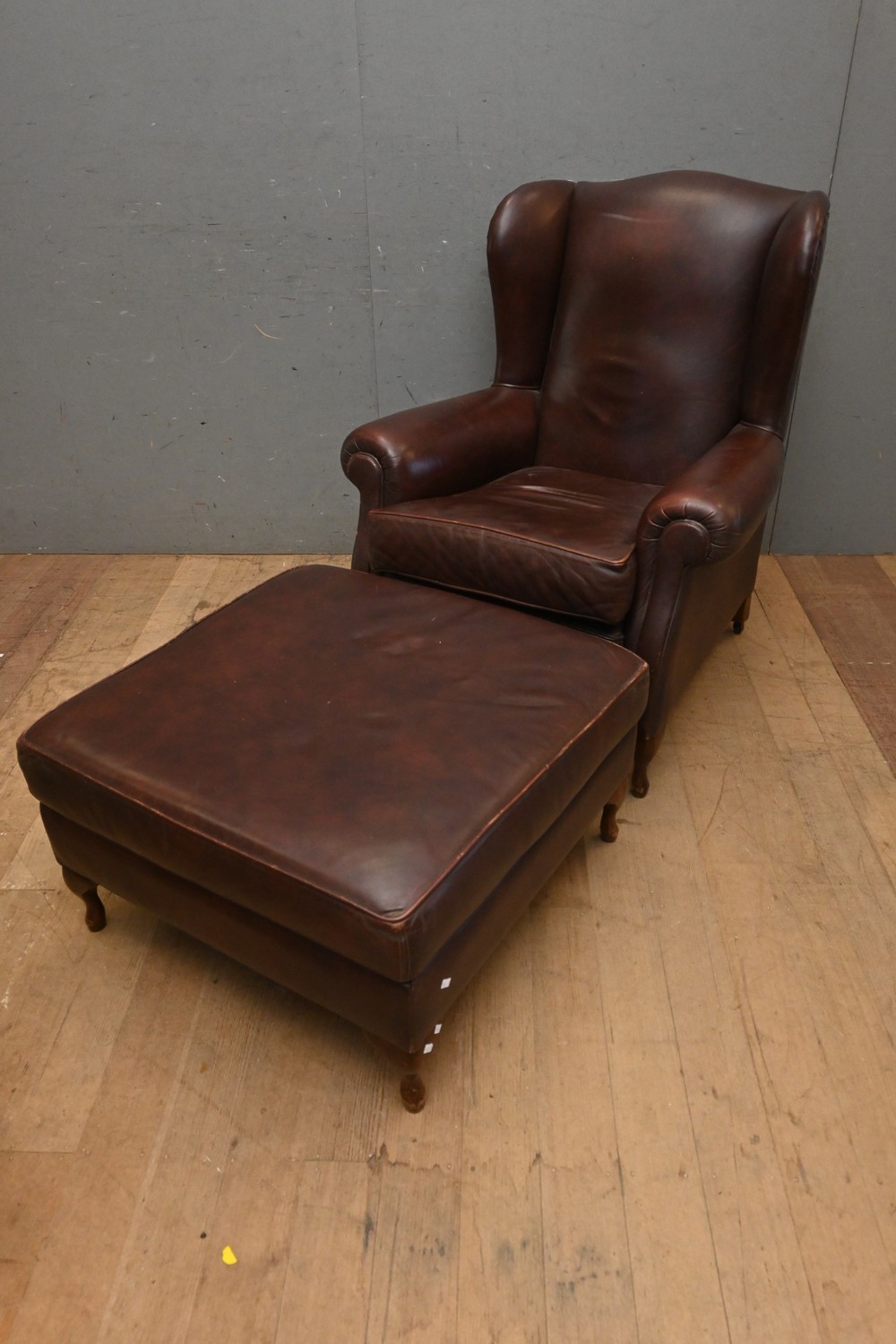 A LEATHER WINGBACK ARMCHAIR WITH MATCHING OTTOMAN (A/F) (101H X 88W X 92D CM) (LEONARD JOEL DELIVERY SIZE: X-LARGE)