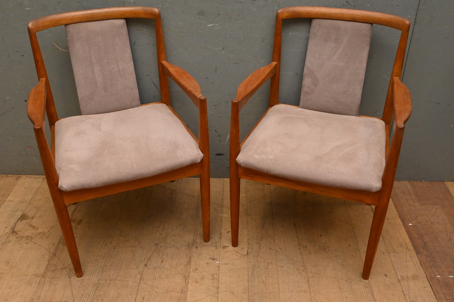 A PAIR OF TEAK PARKER CARVER ARMCHAIRS (A/F) (80H X 56W X 55D CM) (LEONARD JOEL DELIVERY SIZE: LARGE)