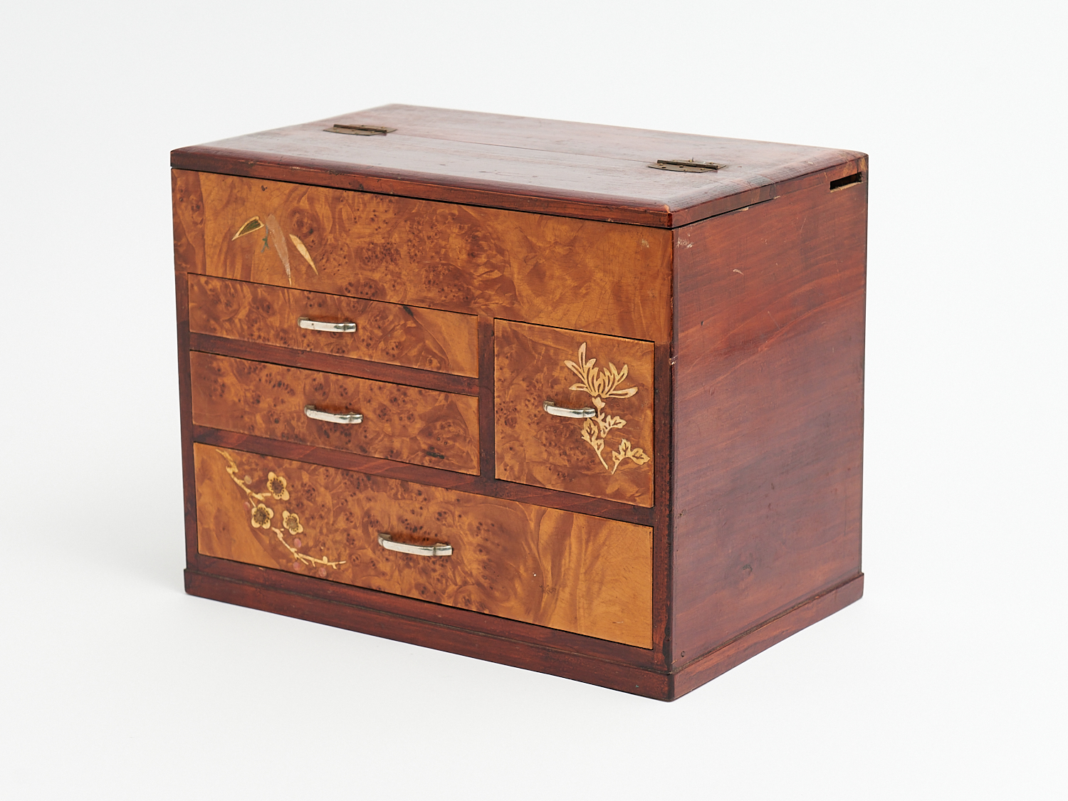 A VINTAGE JAPANESE BURR WOOD FIVE DRAWER SEWING CABINET, H.23CM X W.28CM X D.18CM, LEONARD JOEL LOCAL DELIVERY: MEDIUM