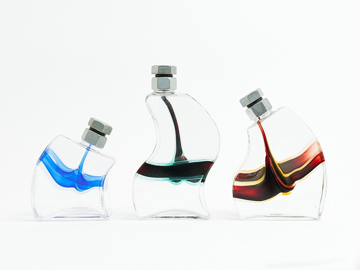 THREE KOSTA BODA "MACHO" DECANTERS BY KJELL ENGMAN, WITH BOXES H.24.5CM (TALLEST), LEONARD JOEL LOCAL DELIVERY: SMALL