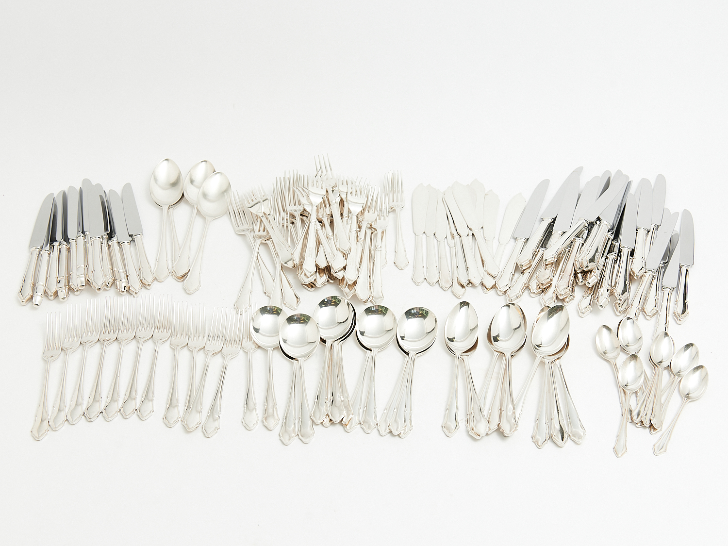 AN ENGLISH STANLEY ROGERS CORONET SILVER PLATE CUTLERY SET FOR 12, LEONARD JOEL LOCAL DELIVERY: SMALL