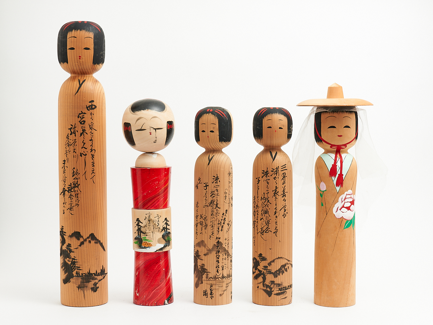 A GROUP OF FIVE LARGE VINTAGE JAPANESE HAND PAINTED AND SIGNED WOODEN KOKESHI DOLLS H.60CM, LEONARD JOEL LOCAL DELIVERY: MEDIUM