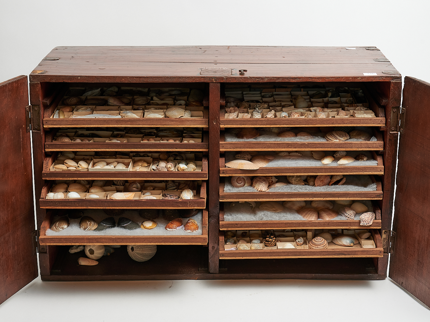 A TIMBER COLLECTORS CABINET WITH SHELVES OF ASSORTED BEACH FOUND SHELLS, H.44 X W.72 X D.32CM, LEONARD JOEL LOCAL DELIVERY: MEDIUM