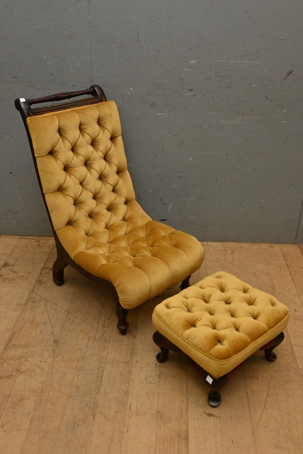A BUTTONBACK VELVET UPHOLSTERED CHAIR AND OTTOMAN (A/F) (H90 X W45 X D74 CM) (LEONARD JOEL DELIVERY SIZE: LARGE)