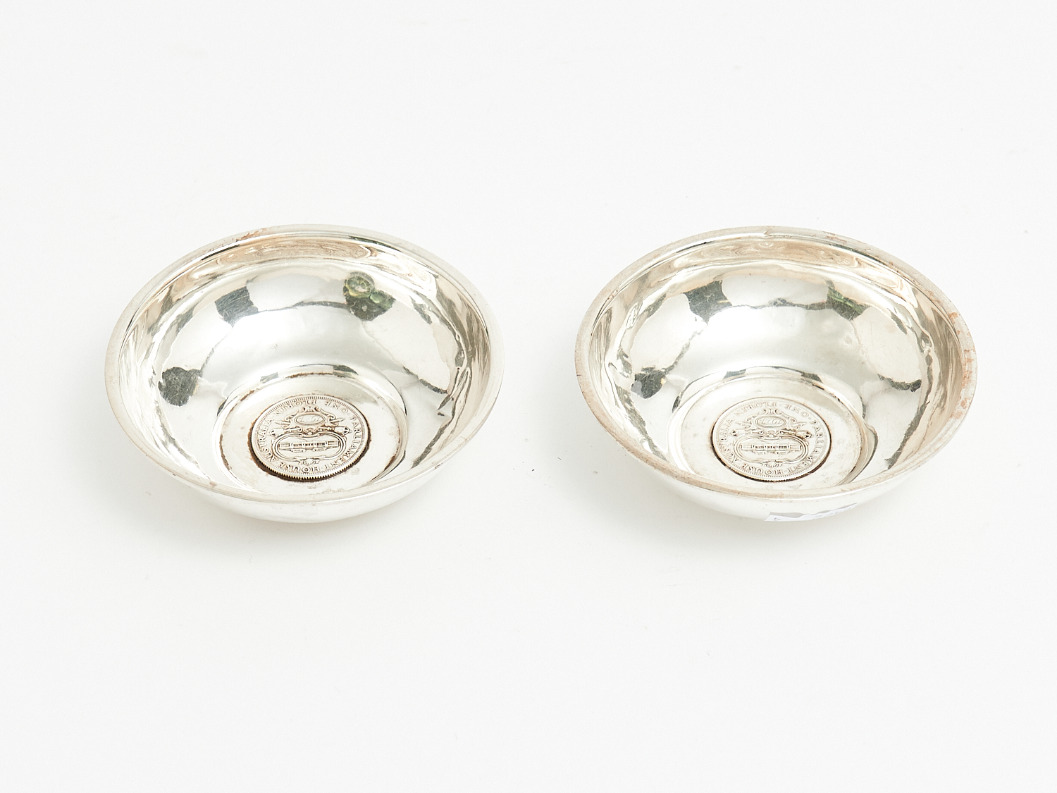A PAIR OF SILVER BOWLS INSET WITH AUSTRALIAN PARLIAMENT HOUSE FLORINS – 87 G DIA.9.5CM, LEONARD JOEL LOCAL DELIVERY: SMALL