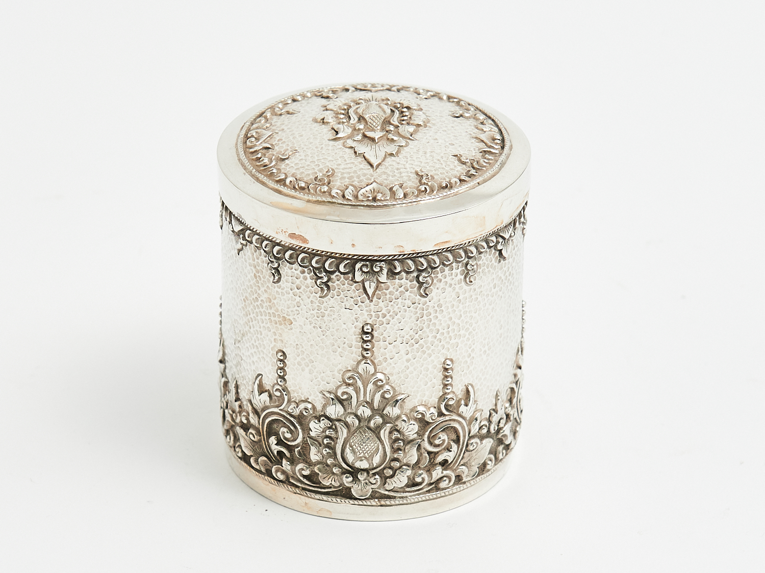 AN 800 SILVER FLORAL AND HAMMERED TEA CADDY – 164 GRAMS H.8.3CM X DIA.7CM, LEONARD JOEL LOCAL DELIVERY: SMALL