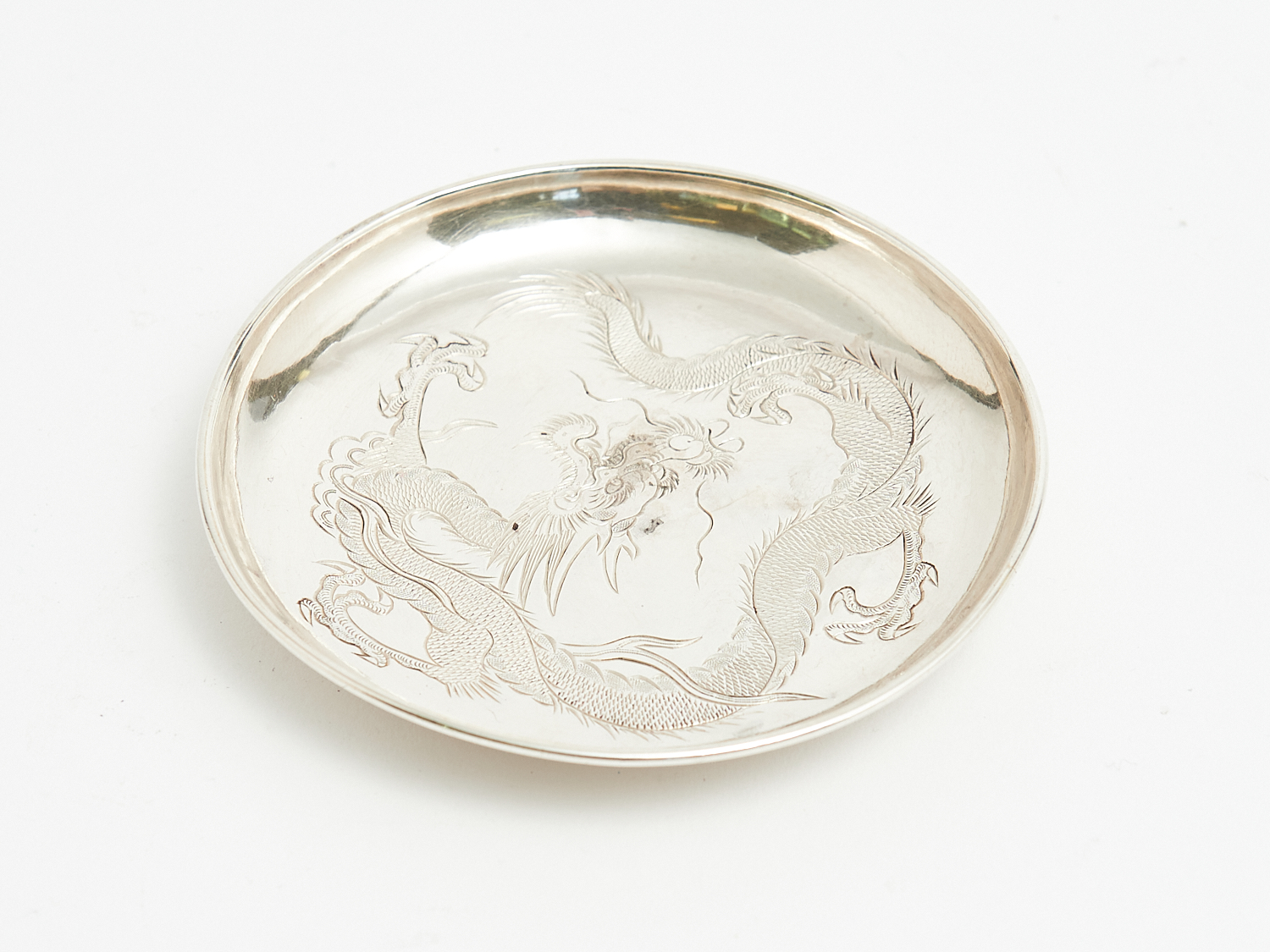 A CHINESE HALLMARKED ENGRAVED DRAGON DISH BY WANG HING – 72 GRAMS DIA.10CM, LEONARD JOEL LOCAL DELIVERY: SMALL