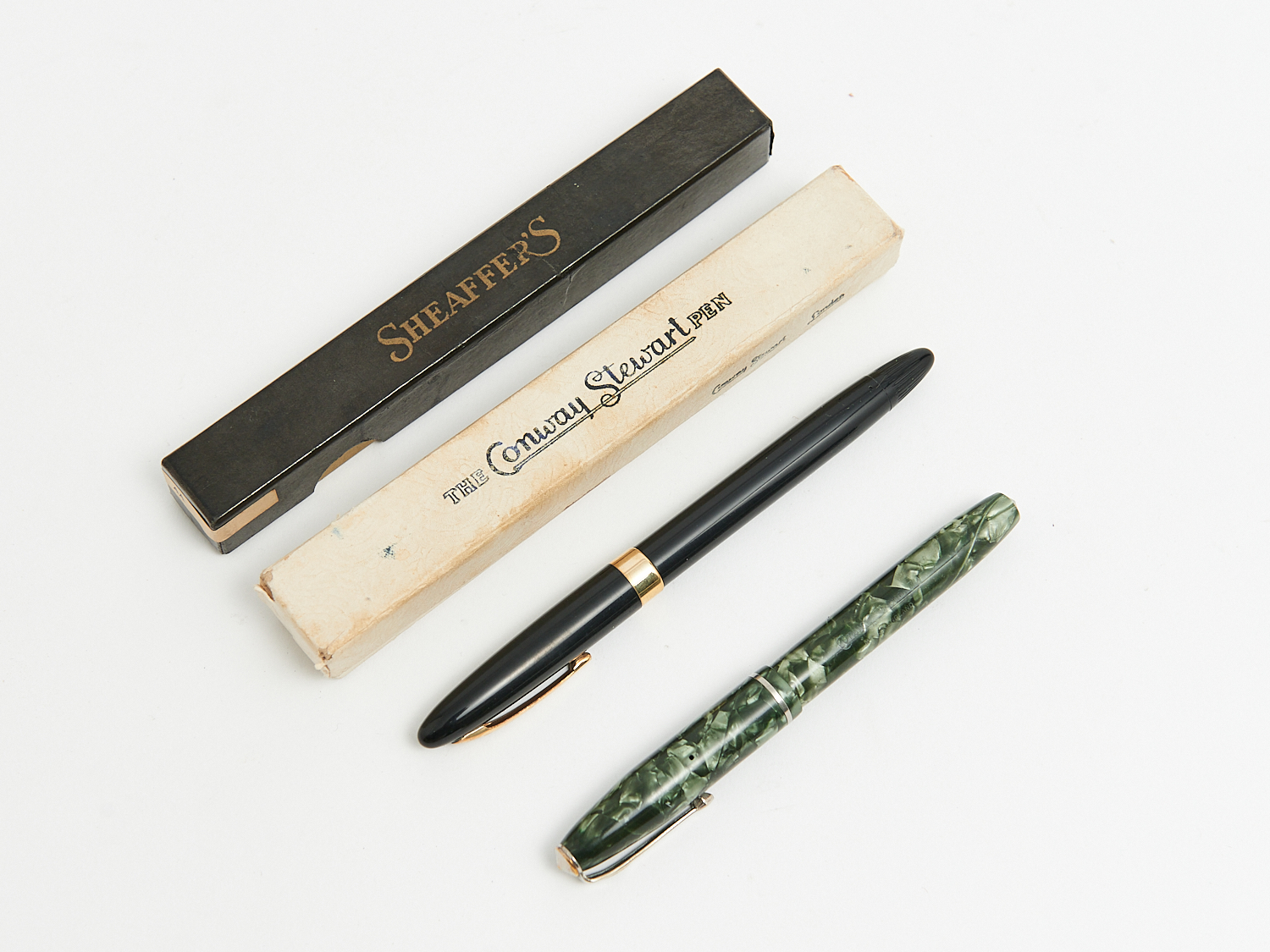 TWO VINTAGE BOXED FOUNTAIN PENS INCLUDING SHEAFFERS AND CONWAY STEWART MARBLED BOTH WITH 14 CT GOLD NIBS, LEONARD JOEL LOCAL DELIVERY: SMALL