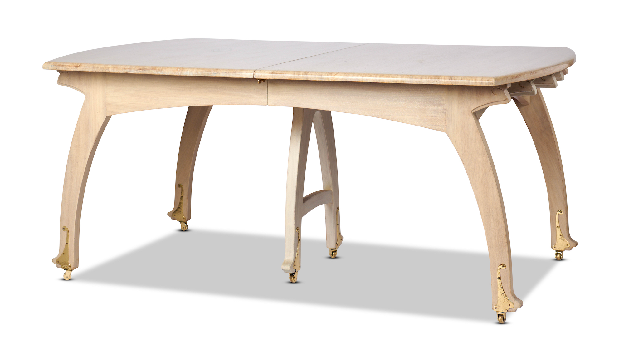 Extension dining table. Limed finish with brass hardware and castors. Stamped to base. Comes with two party leaves.