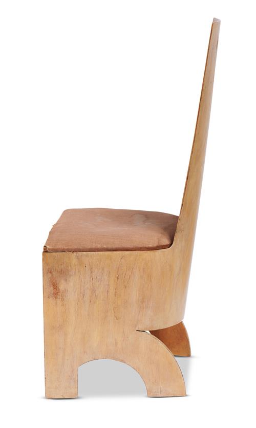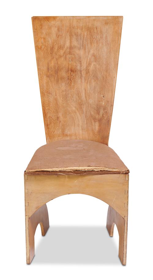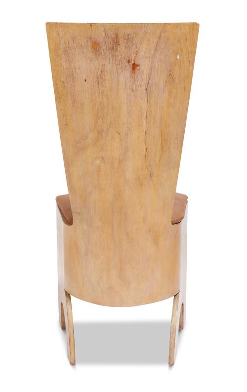 Summers didn't exploit the potential of the cariable curve that he produced in this chair. The thin aircraft plywood starts off tight were glued to the cut-out ply forming the shape of the seat. Where there is no structure however, the chair is is left to its own devices and fans toward the top.
