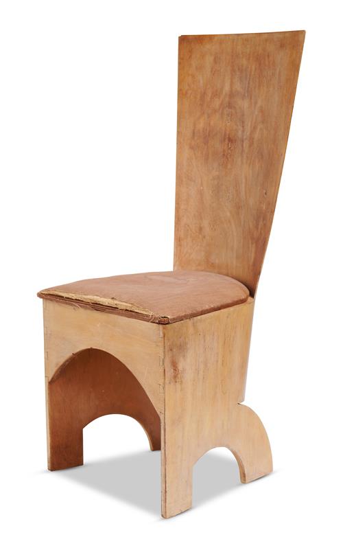 Surface scratches and marks to the entire body of chair. There is a small 8 cm repair to the edge of the chair where it joins near the seat. Original fabric has stains and losses. Significant tears to the front of seat, all consistent with age and use. The chair is structurally sound and in original condition.