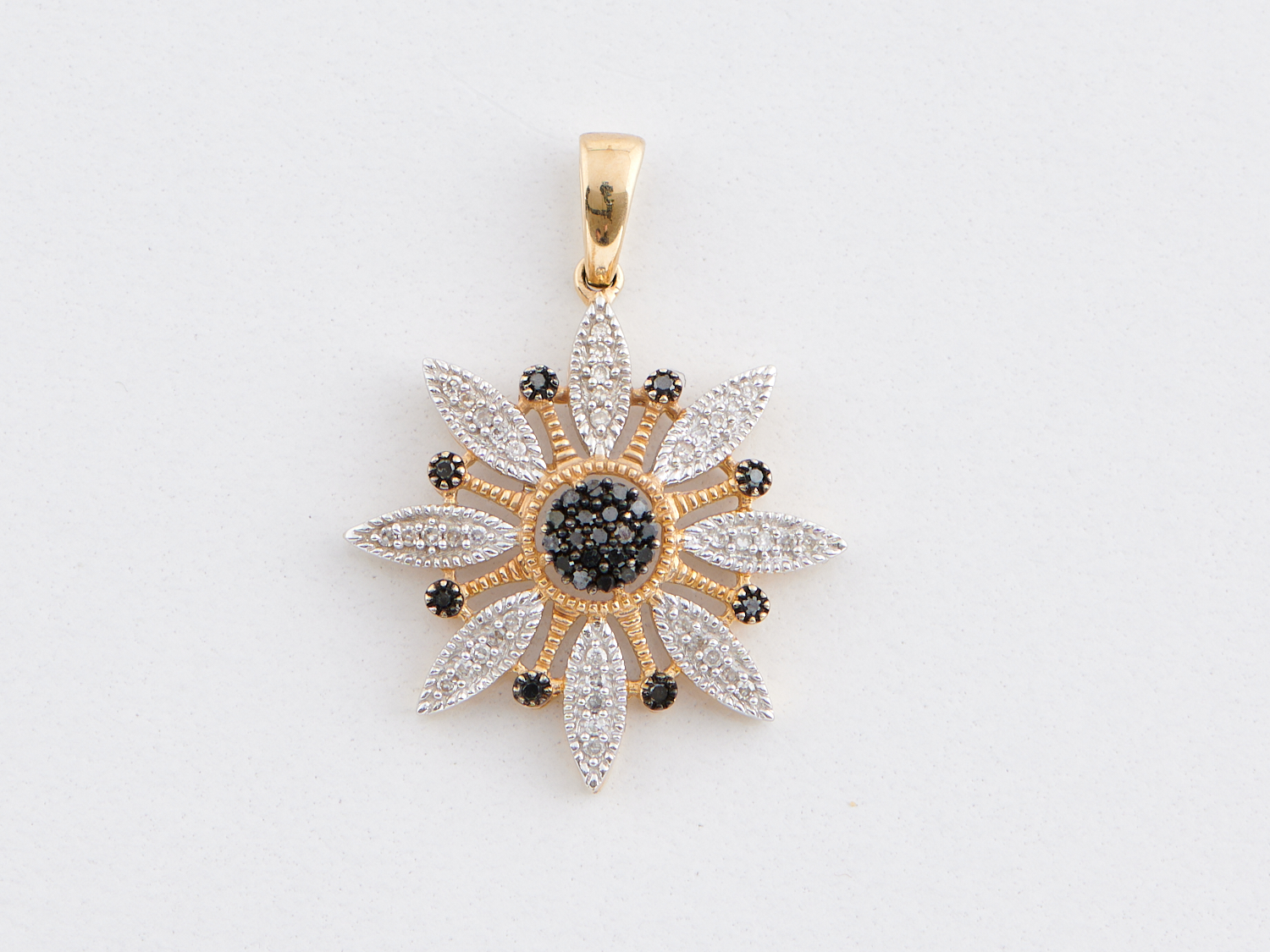 A BLACK AND WHITE DIAMOND SET SNOW FLAKE PENDANT IN 10CT GOLD, DIAMETER 20MM, WEIGHT 2.4GMS