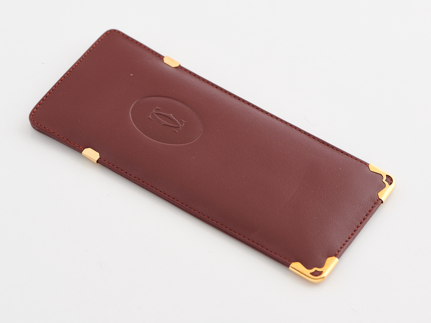 CATRIER, OPTICALS POUCH - Styled in burgundy leather, with gold tone hardware.