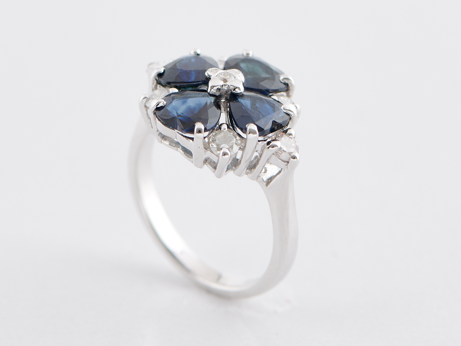 A BLUE SAPPHIRE SET RING IN 18CT WHITE GOLD, THE HEART SHAPE SAPPHIRES TOTALLING APPROXIMATELY 3.44CTS, THE DIAMONDS TOTALLING APPROXIMATELY 0.50CTS, RING SIZE M, WEIGHT 5.6GMS