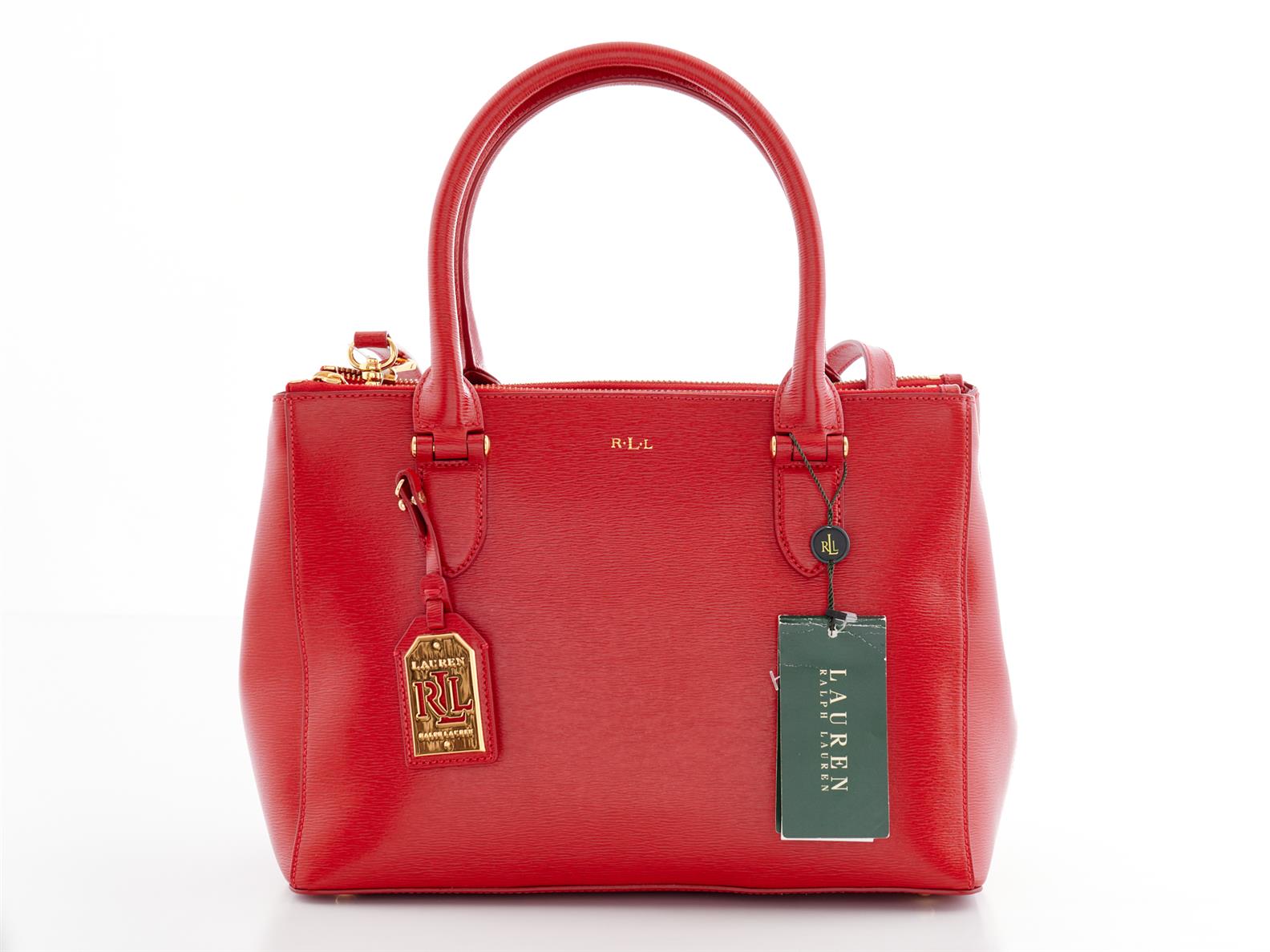 LAUREN RALPH LAUREN, HANDBAG - Styled in lipstick red embossed leather and gold tone hardware, with dual rolled leather handles, dual zip compartments and optional shoulder strap, accompanied by original dust bag, 22 x 30 x 14cm.