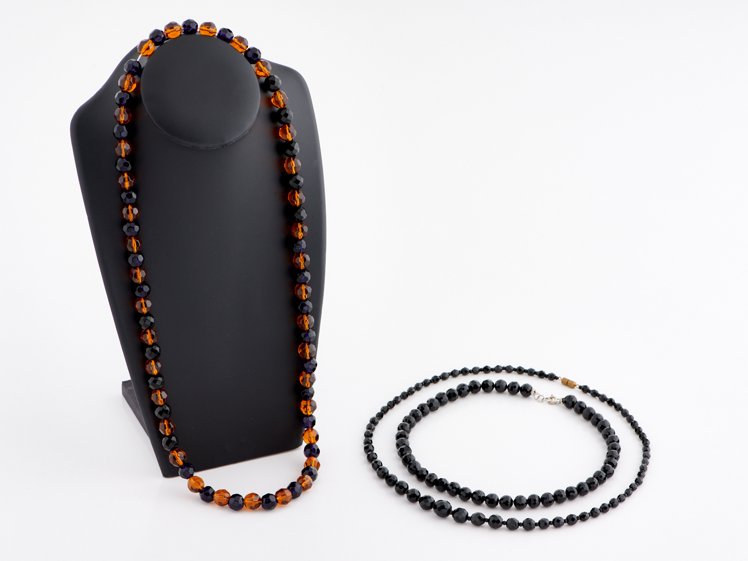 TWO FRENCH JET NECKLACES, LENGTHS 620MM AND 460MM, TOGETHER WITH A COMPOSITE BEAD NECKLACE, LENGTH 830MM