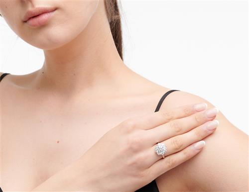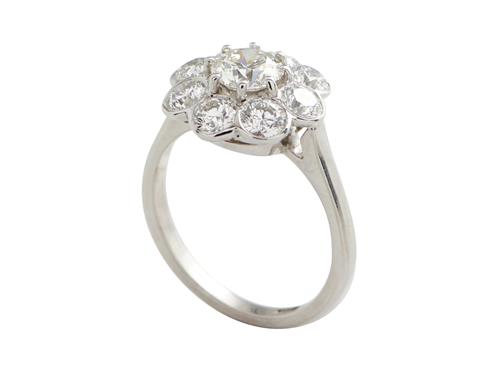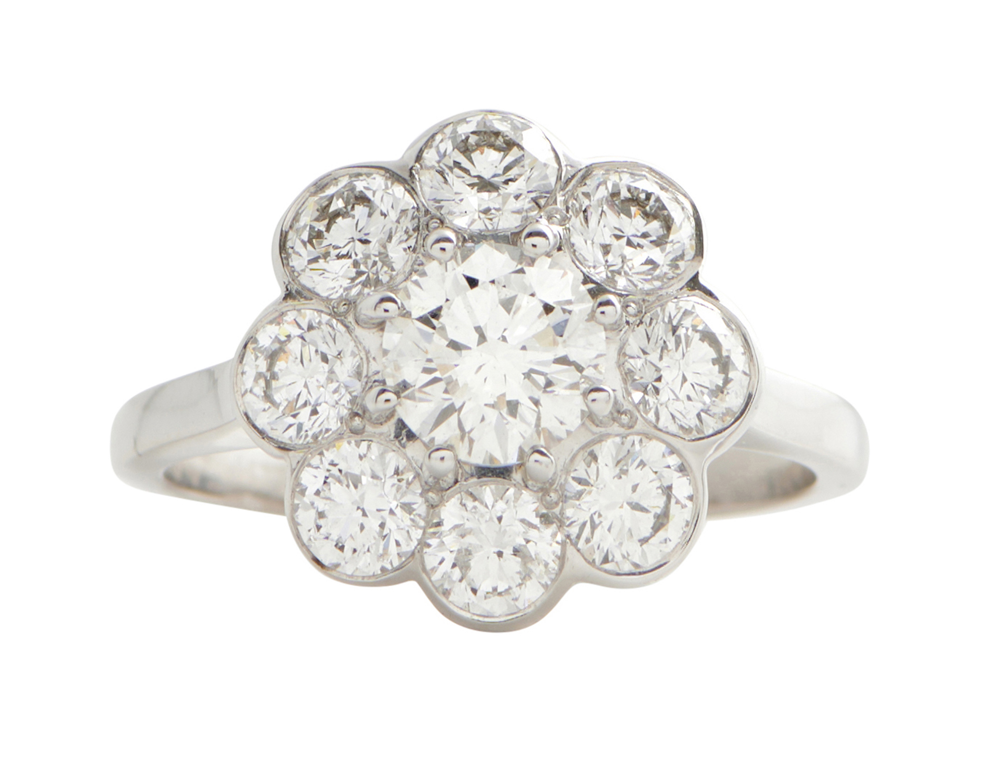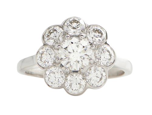 Of floral cluster design, centring a claw-set brilliant-cut diamond weighing approximately 0.75 carats, within a surround of eight further brilliant-cut diamonds together weighing approximately 1.50 carats, size M.