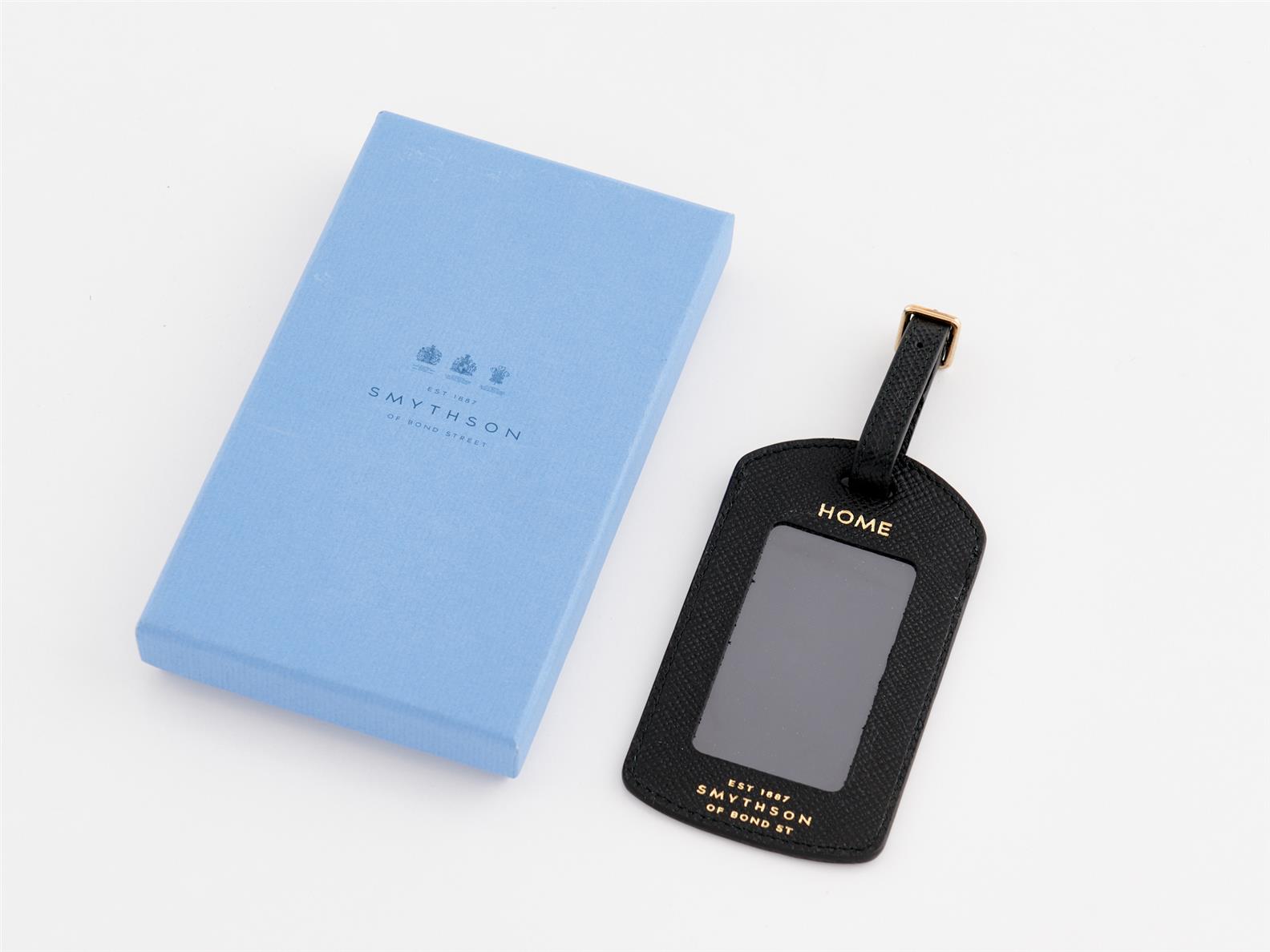 SMYTHSON, LUGGAGE TAG - Styled in black leather, boxed.