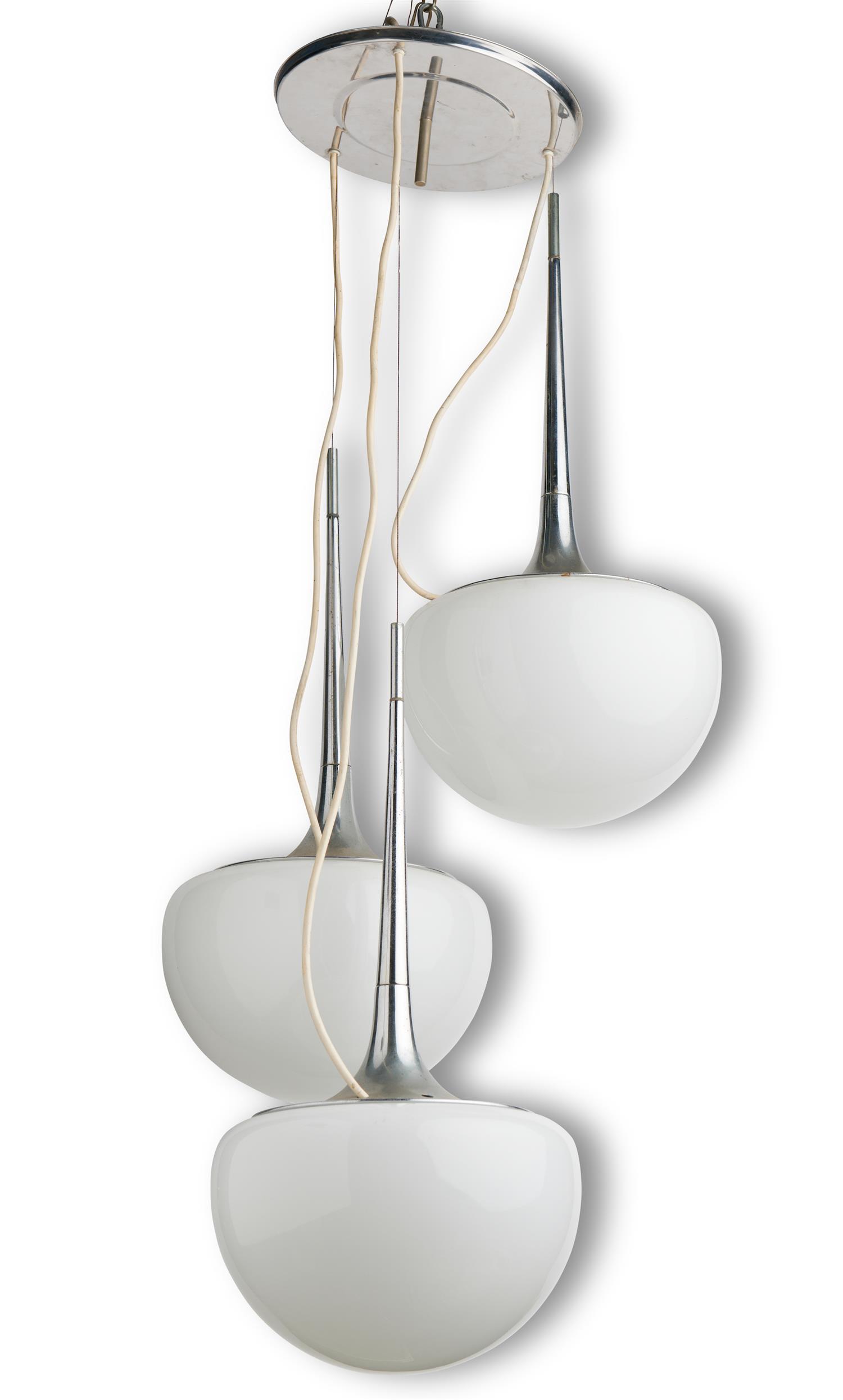 Minor signs of rust and patina development to polished chrome and metal fittings. Marks and surface scratches are present, all consistent with the age and previous use of the light. Signs of discolouration and staining to the electrified cords. No cracks, chips or losses to the glass domes. Original condition.