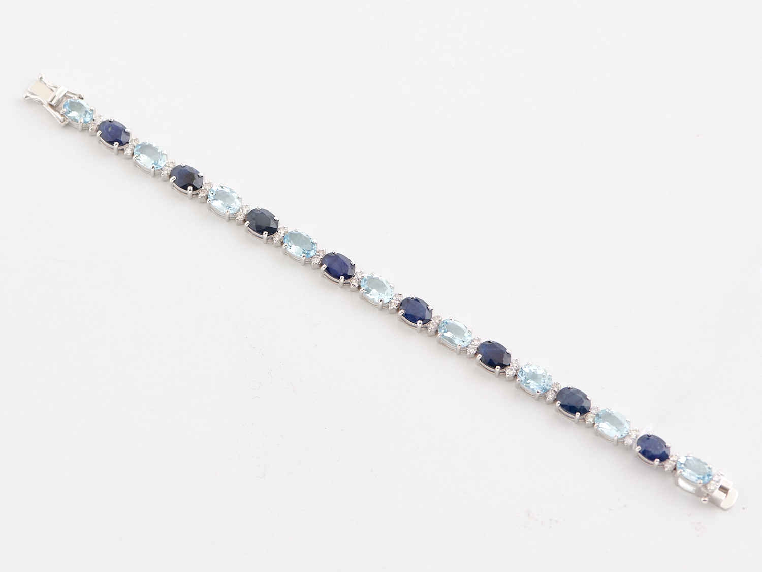 A SAPPHIRE AND AQUAMARINE BRACELET IN 18CT WHITE GOLD, THE SAPPHIRES TOTALLING 12.40CTS, THE AQUAMARINES TOTALLING 10.25CTS AND DIAMONDS TOTALLING 1.60CTS, ACCOMPANIED BY VALUATION, SIZE 6.0 X 180MM, WEIGHT 18.6MM