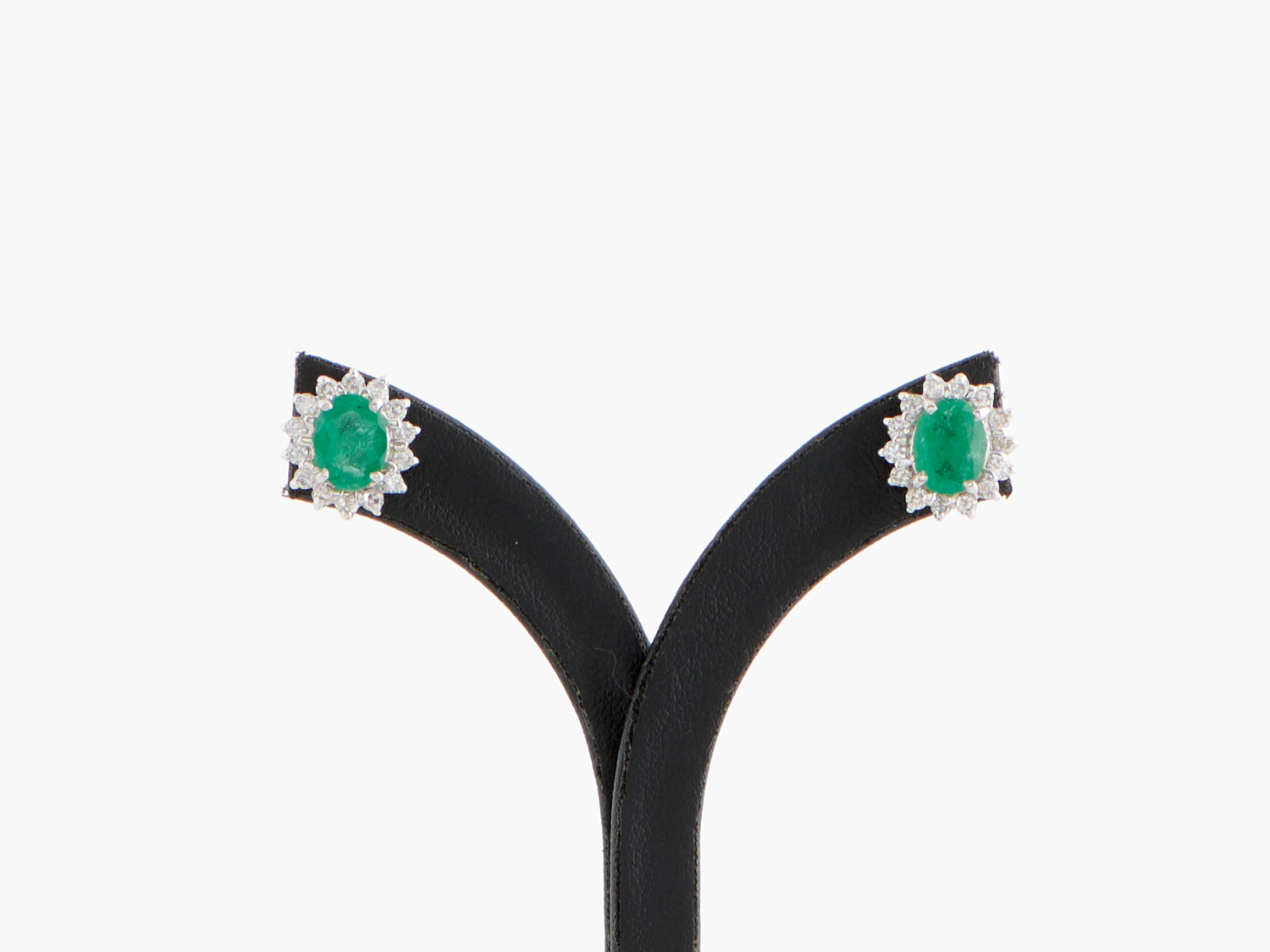 A PAIR OF EMERALD AND DIAMOND SET EAR STUDS TO POST AND BUTTERFLY FITTINGS IN 18CT WHITE GOLD, THE EMERALDS WEIGHING 2.80CTS, THE DIAMONDS WEIGHING 0.78CTS, SIZE 11 X 13MM, WEIGHT 3.89GMS, WITH VALUATION