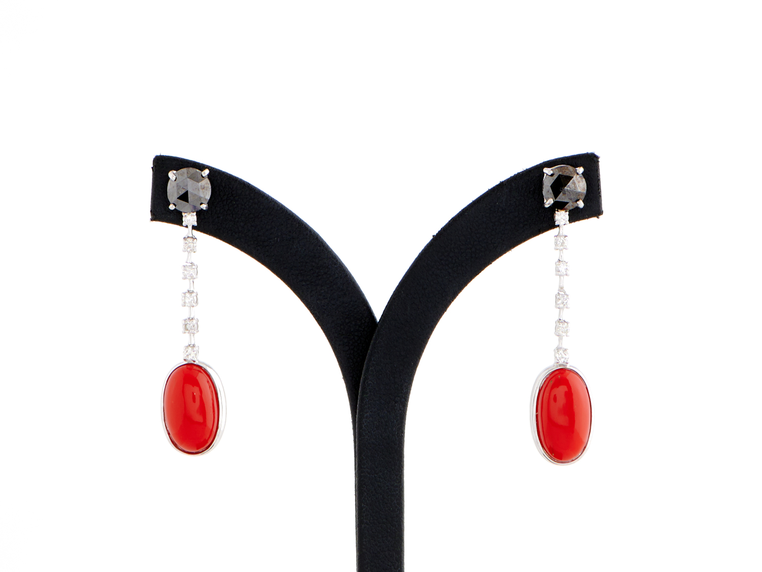 A PAIR OF BLACK DIAMOND, DIAMOND AND CORAL DROP EARRINGS IN 18CT WHITE GOLD, FEATURING CORAL DROPS TOTALLING 11.24CTS, SUSPENDED BELOW ROSE CUT BLACK DIAMONDS TOTALLING 3.36CTS, FEATURING A ROW OF WHITE DIAMONDS TOTALLING 0.38CTS, TO POST AND BUTTERFLY FITTINGS