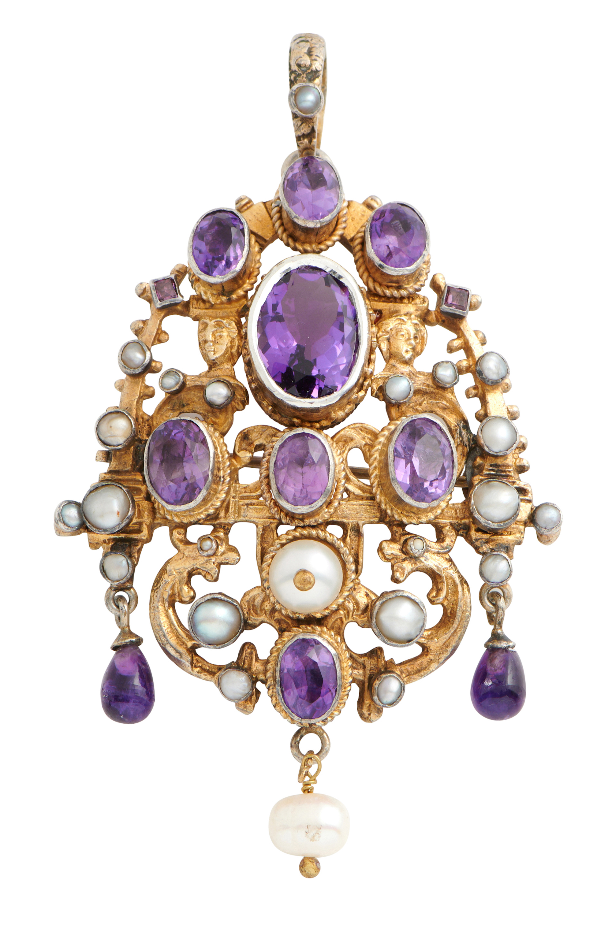 SILVER GILT, AMETHYST AND PEARL BROOCH/PENDANT, AUSTRO-HUNGARIAN
