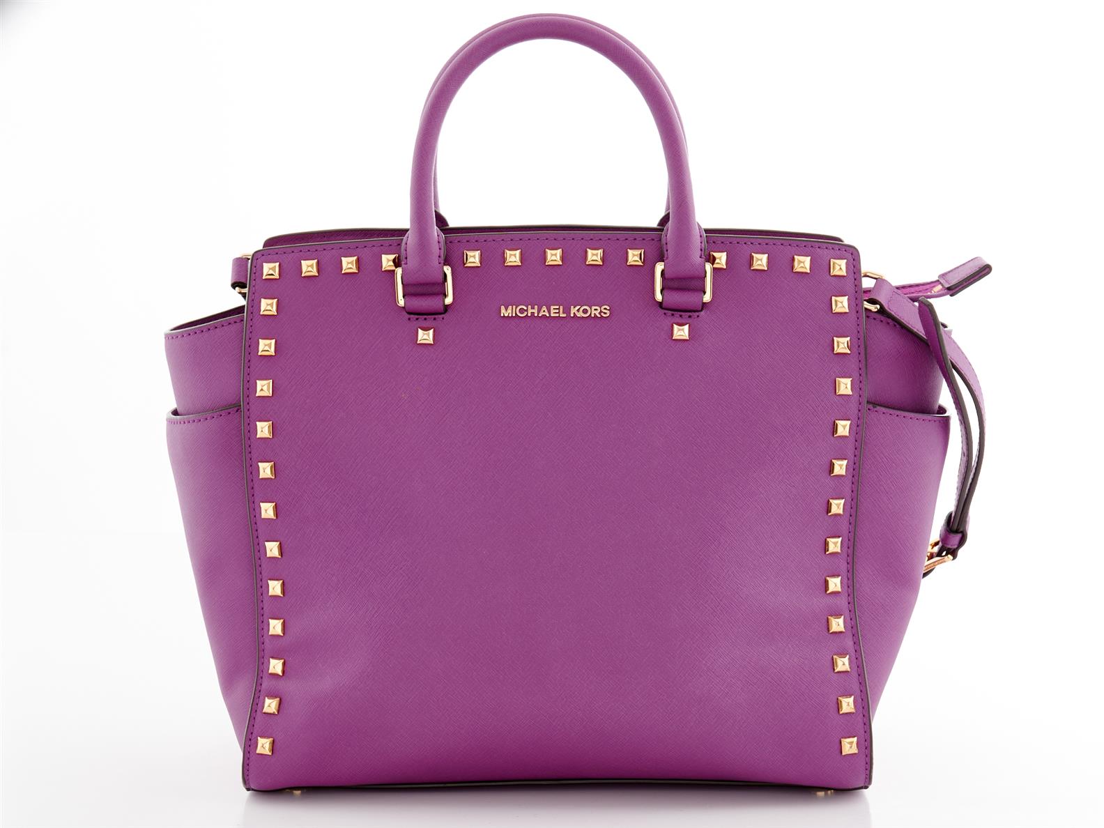MICHAEL KORS, HANDBAG - Styled in purple embossed leather, with gold tone studs, dual rolled leather handles and optional shoulder strap, 29 x 38 x 12cm.