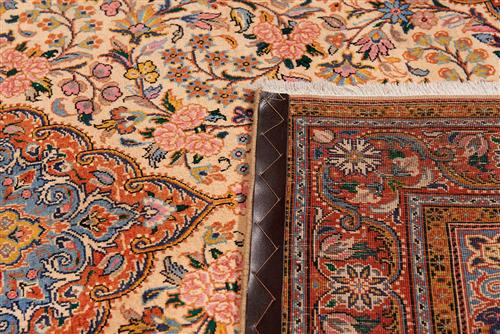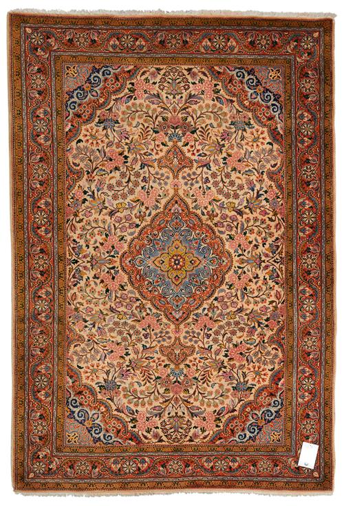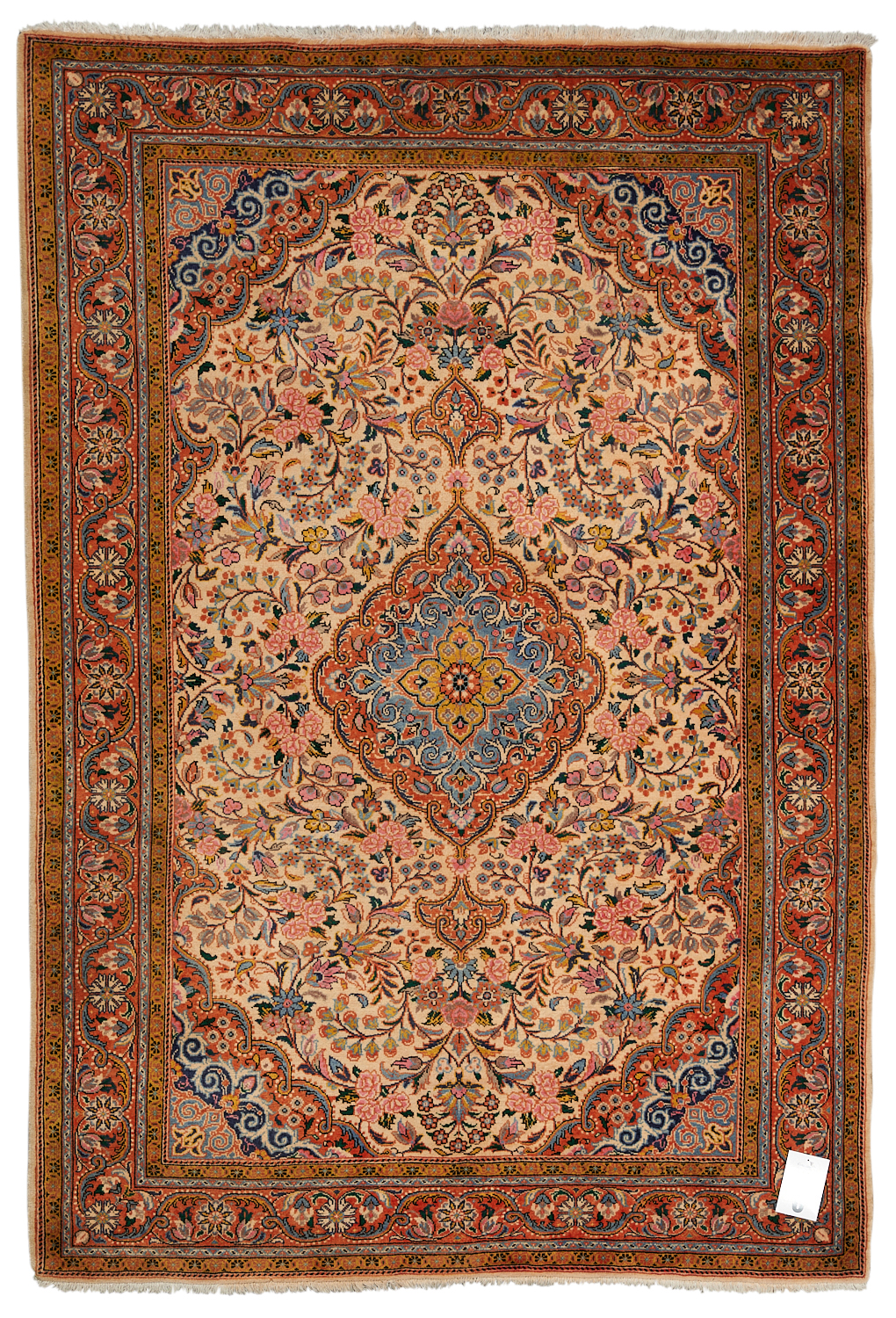 A FABULOUS FINE PERSIAN BIDJAR RUG.100% WOOL. FLORAL CENTRAL ELONGATED MEDALLION ON A CREAM FIELD CONTAINING ALL OVER FLORAL BLOSSOMS, LILLY, AND CARNATIONS. UNIQUE CORNER SCROLL MEDALLIONS OF ROYAL BLUE AND SOFT BLUE. BORDER OF ROSETTES AND SCROLLS. SIZE: 202 X 140 CM ORIGIN: PERSIA – RRP: $2,800 DOCUMENTATION OF AUTHENTICITY INCLUDED.