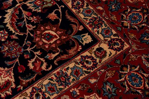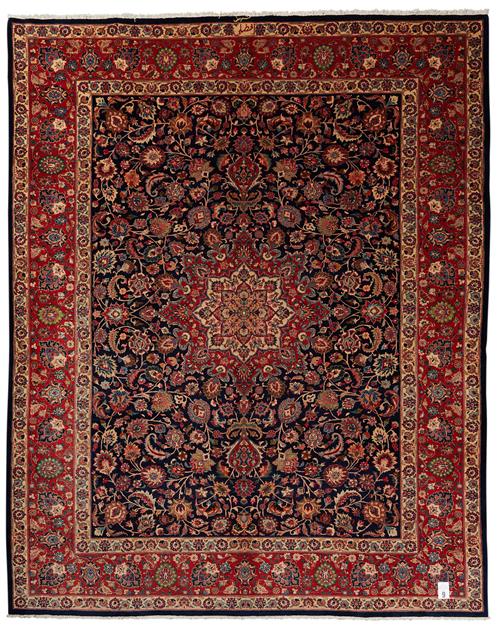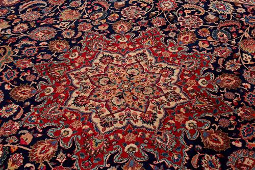 A STUNNING FINE PERSIAN SOLID & DENSE KHORASAN CARPET.100% THICK WOOL, PLUSH PILE, HARD-WEARING. HAND-KNOTTED WEAVE WITH A CENTRAL FLORAL ELONGATED MEDALLION WITH ALL OVER SHA ABBAS PALMETTES IN FRENCH BLUE, ROSE AND CREAM IN A DEEP BLUE FIELD OF FOLIAGE AND FLORAL SPRAYS. MAJOR BORDER OF PALMETTES IN A SOFT TERRACOTTA, MINOR BORDER OF FLORAL SPRAYS IN CREAM. SIGNED PIECE ‘MASHAD FAZLI' ATELIER. SIZE: 390 X 310 CM ORIGIN: PERSIA – RRP: $11,000 DOCUMENTATION OF AUTHENTICITY INCLUDED.