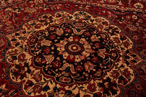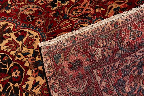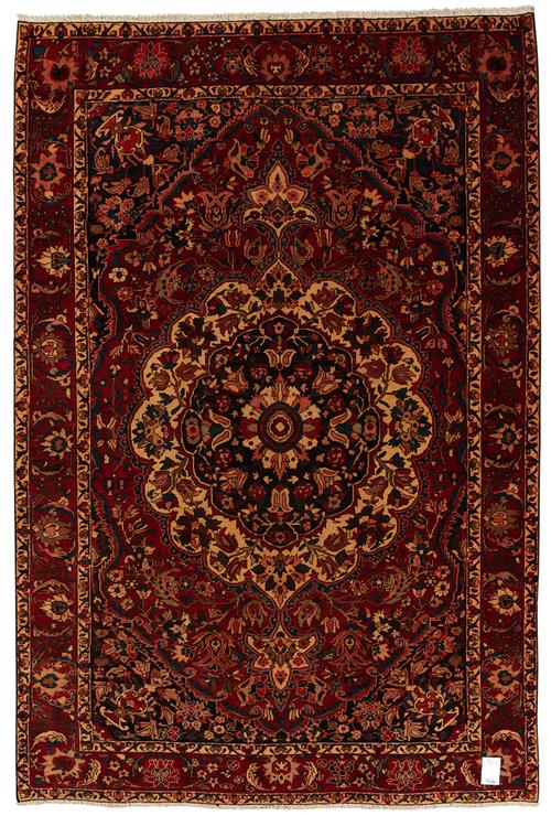 A CIRCA 1970'S PERSIAN BAKHTIAR SAMAN RUG, 100% WOOL. HAND KNOTTED TRIBAL BAKHTIARI WEAVE AND DESIGN OF BOLD ANCHORED FLORAL MEDALLION AND QUARTERED CORNER MEDALLIONS IN A SUBTLE RED FIELD OF FLORAL MOTIFS AND TENDRILS. BORDER OF PALMETTES AND TENDRILS. SIZE: 300 X 205 CM ORIGIN PERSIA ORIGIN: INDIA – RRP: $4,500 DOCUMENTATION OF AUTHENTICITY INCLUDED.