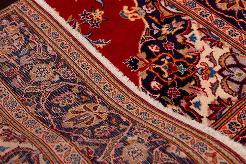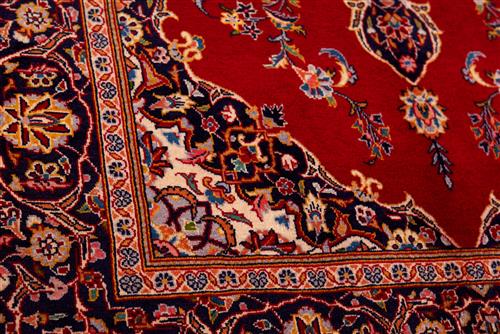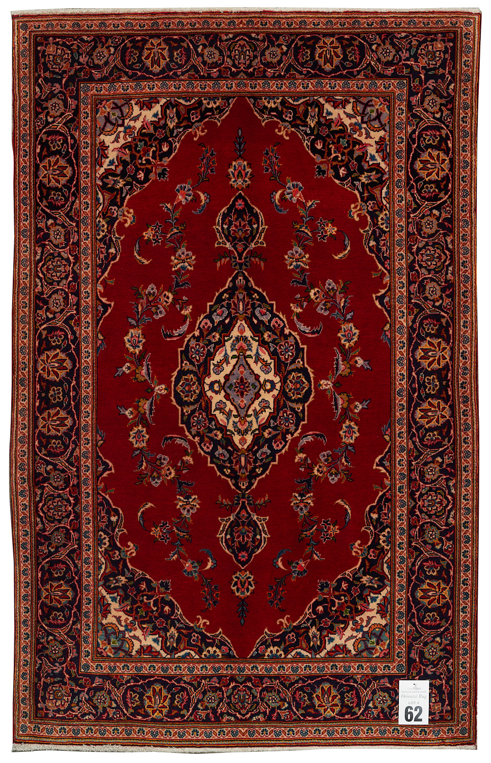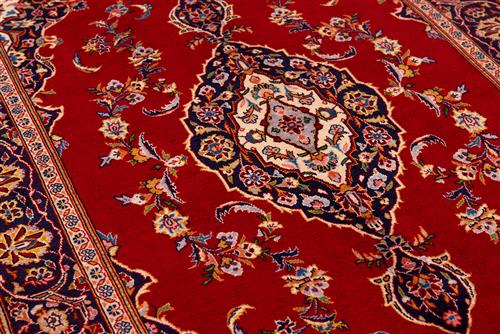 A SUPER FINE PERSIAN ROYAL KASHAN RUG. 100% LAMBS WOOL. CENTRAL ELONGATED MEDALLION ON A RUBY FIELD OF FLORAL SPRAYS AND TENDRILS. BORDER OA PALMETTES, ROSETTES, FLORAL SPRAYS ON AN INDIGO BLUE FIELD. RRP: $2,100 - SIZE: 180 X 110 CM ORIGIN: PERSIA DOCUMENTATION OF AUTHENTICITY INCLUDED.