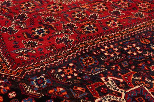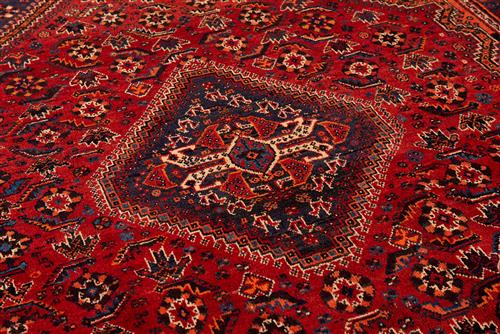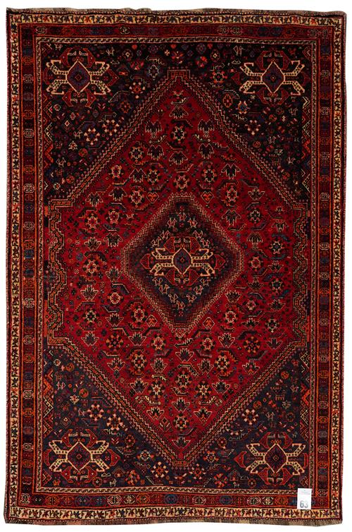 A NOMADIC SHISH BALUKI PERSIAN QASHQAIE RUG. 100% HAND SPUN WOOL, NATURAL DYES, EXTREMELY DENSE AND SOLID HEAVY PILE. HAND-KNOTTED NOMADIC QASHQAIE WEAVE FROM THE FARS PROVINCE WITH TRIBAL DESIGN OF DIAMOND-SHAPED MEDALLION CONTAINING AN AMULET SET WITHIN A SOFT RED FIELD OF TRIBAL MOTIFS AND ROSETTES. CORNER MEDALLIONS IN NAVY CONTAINING TRIBAL MOTIFS, ROSETTES, AND ANIMAL MOTIFS. BORDER OF TRIBAL BUTTERFLIES AND MINI ROSETTES. GLOSSY SHEEN TO THE PILE. ORIGIN: IRAN. SIZE: 260 X 171 CM - RRP: $4,500 DOCUMENTATION OF AUTHENTICITY INCLUDED