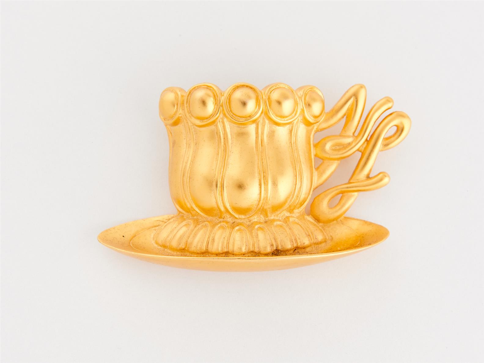 KARL LAGERFELD, BROOCH - The gold plated brooch styled in the form of a teacup with KL signature handle, 8.5 x 5cm.