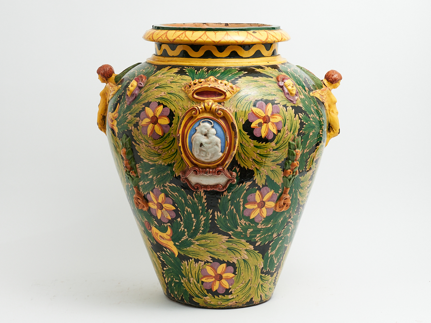 A LARGE AND IMPRESSIVE LATE 19TH C MAJOLICA GLAZED CERAMIC VASE IN THE MANNER OF ALBERT LOUIS DAMMOUSE (A/F) H.56CM, LEONARD JOEL LOCAL DELIVERY: MEDIUM