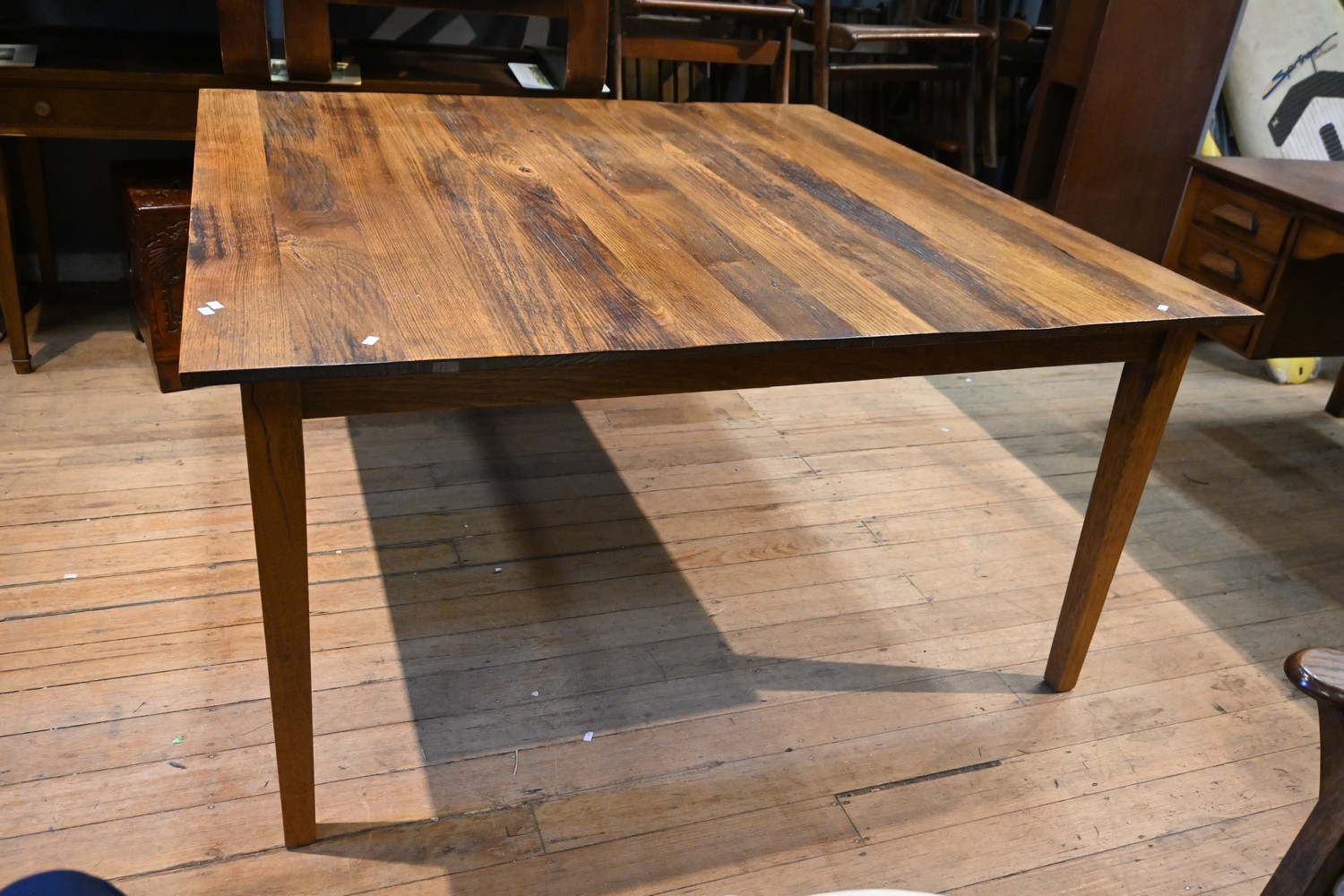 A SQUARE TIMBER DINING TABLE (77H X 150W X 150D CM) (PLEASE NOTE THIS HEAVY ITEM MUST BE REMOVED BY CLIENTS OR CARRIERS AT THE CUSTOMERS EXPENSE. LEONARD JOEL STAFF CANNOT ASSIST CARRYING THIS ITEM)