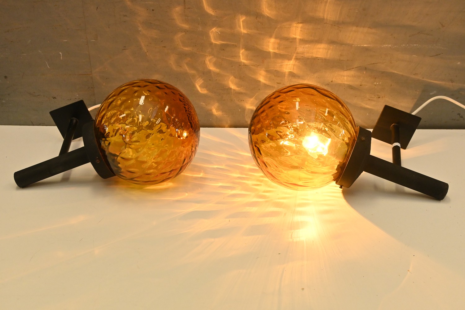 A PAIR OF 1970S OUTDOOR LIGHTS WITH AMBER GLASS ( 39H X 26W CM) (LEONARD JOEL DELIVERY SIZE: MEDIUM)