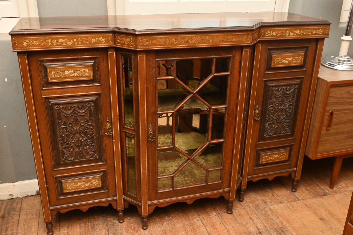 A LATE VICTORIAN INLAID AND GLAZED SIDE CABINET (A/F) (106H X 152W X 50D CM) (PLEASE NOTE THIS HEAVY ITEM MUST BE REMOVED BY CLIENTS OR CARRIERS AT THE CUSTOMERS EXPENSE. LEONARD JOEL STAFF CANNOT ASSIST CARRYING THIS ITEM)