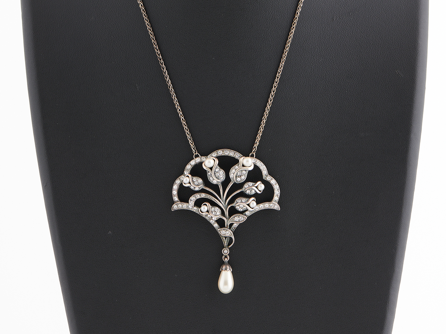 A VINTAGE CRYSTAL AND FAUX PEARL SET PENDANT IN STERLING SILVER, TO A CONFORMING CHAIN, THE PENDANT MEASURING APPROXIMATELY 50 X 60MM