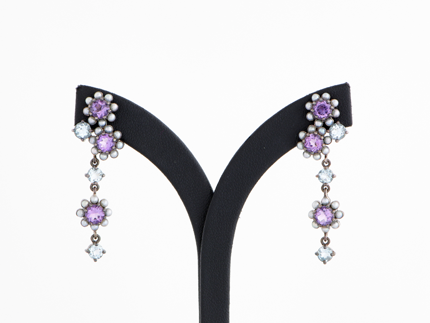 A PAIR OF SEED PEARL AND GEMSET DROP EARRINGS IN STERLING SILVER, TO POST AND BUTTERFLY FITTINGS