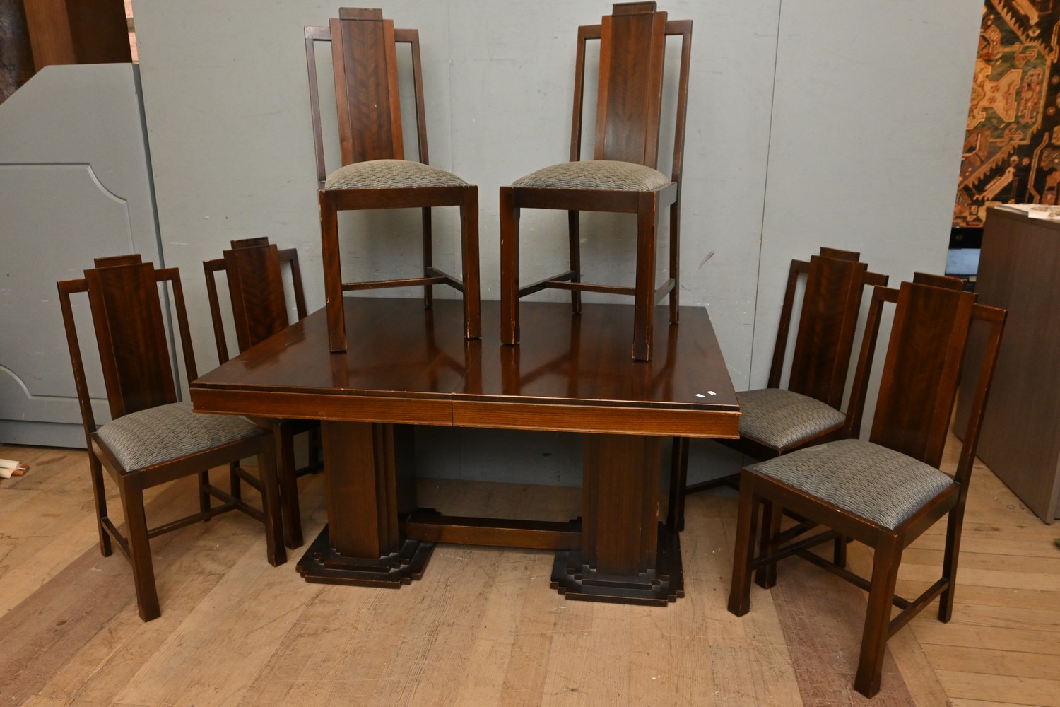 AN ART DECO DINING SUITE OF A DINING TABLE AND SIX CHAIRS (A/F) (76H X 138W X 108D CM) (PLEASE NOTE THIS HEAVY ITEM MUST BE REMOVED BY CLIENTS OR CARRIERS AT THE CUSTOMERS EXPENSE. LEONARD JOEL STAFF CANNOT ASSIST CARRYING THIS ITEM)
