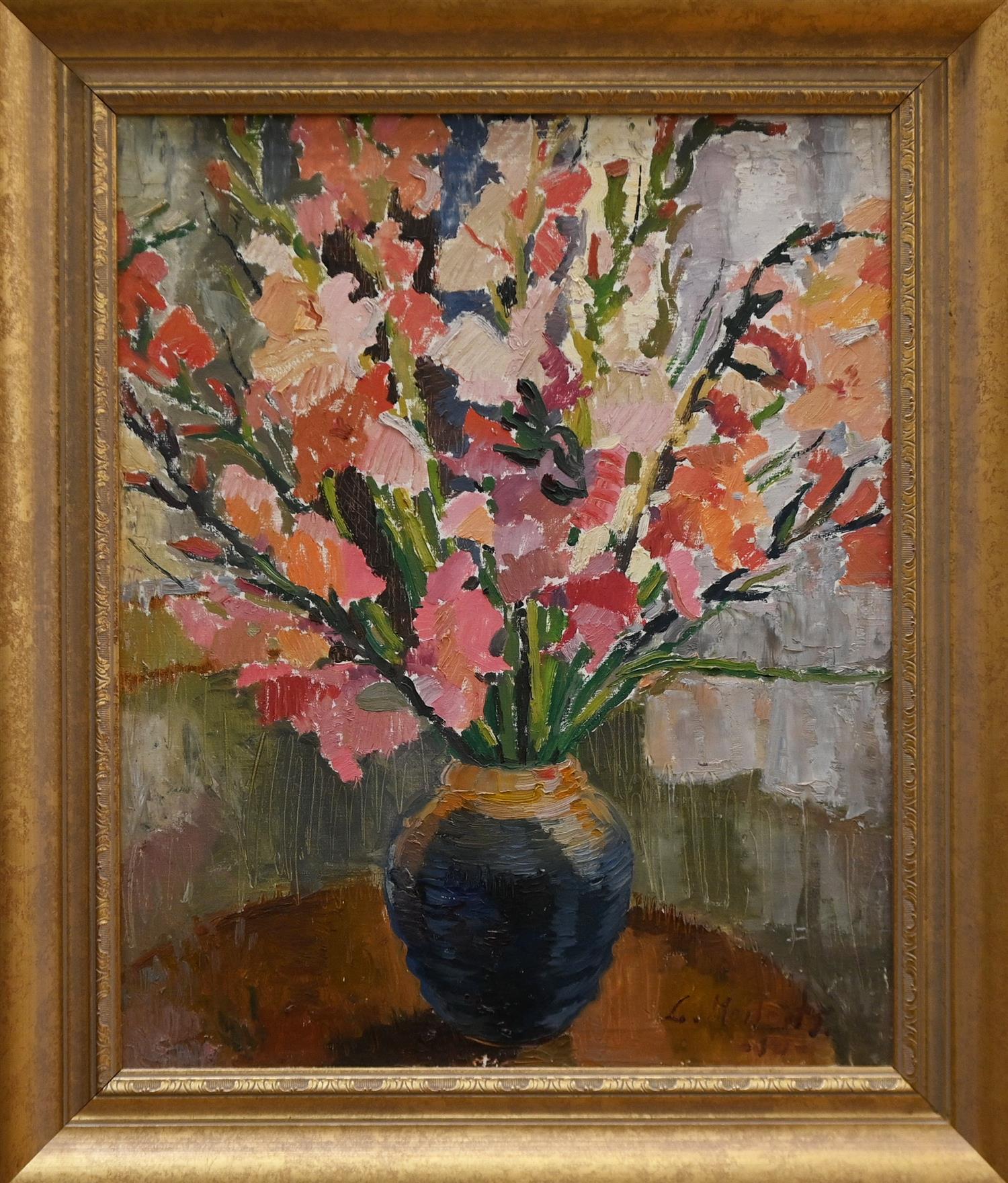 There is cracking and minor paint loss seen to the upper centre of the work and the lower centre edge indicative of the technique. Overall framed size is 92 x 77cm