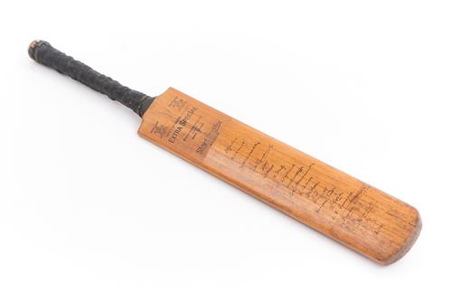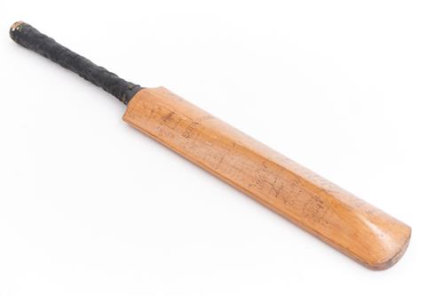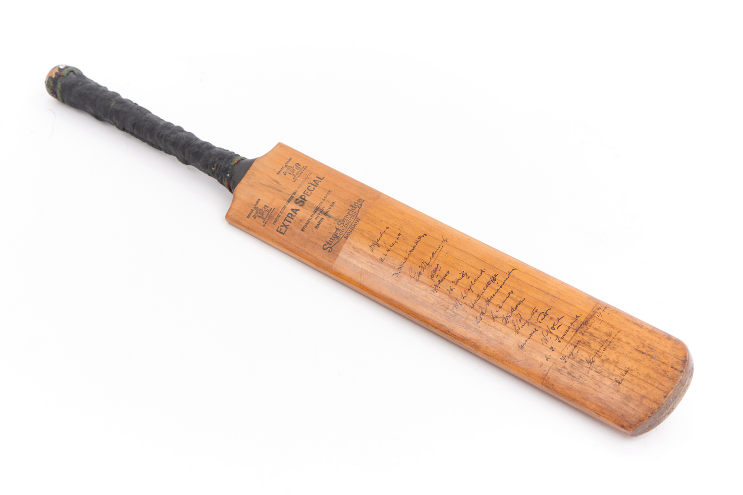 A full size "Stuart Surridge" cricket bat, signed on front by England's 1932-33 team, with 16 signatures including Douglas Jardine, R.E.S.Wyatt & Gubby Allen; also signed on front by 1947 Fiji team (4 signatures) and on reverse by Sir Julien Cahn's XI (14 signatures), 1934-35 England Womens team (16 signatures), 1934-35 NZ Womens team (12 signatures), 1935-36 England team (12 signatures) and 1936-37 England Team (15 signatures)