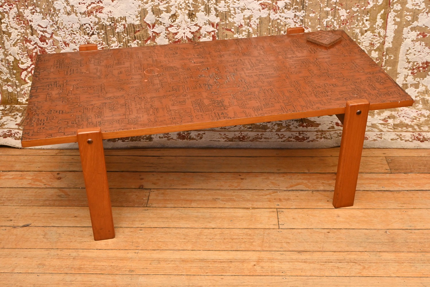 A DANISH 1960S PRESSED COPPER TOP COFFEE TABLE (A/F) (42H X 122W X 66D CM) (LEONARD JOEL DELIVERY SIZE: LARGE)